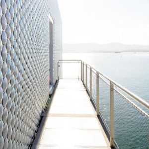 Obiekt otwarty został 23 czerwca i reprezentuje elementy najbardziej charakterystyczne dla architektury Piano. Należy do nich zestawienie stylu postmodernistycznego z elementami high-tech. Bryły zdają się przypominać statki kosmiczne umieszczone na słupach. Imponująca konstrukcja schodów, wykonana z lakierowanego na szaro metalu, dopełniona została 270 tysiącami pojedynczych ceramicznych dysków, które pokrywają ciągi komunikacyjne i odbijają hiszpańskie słońce.