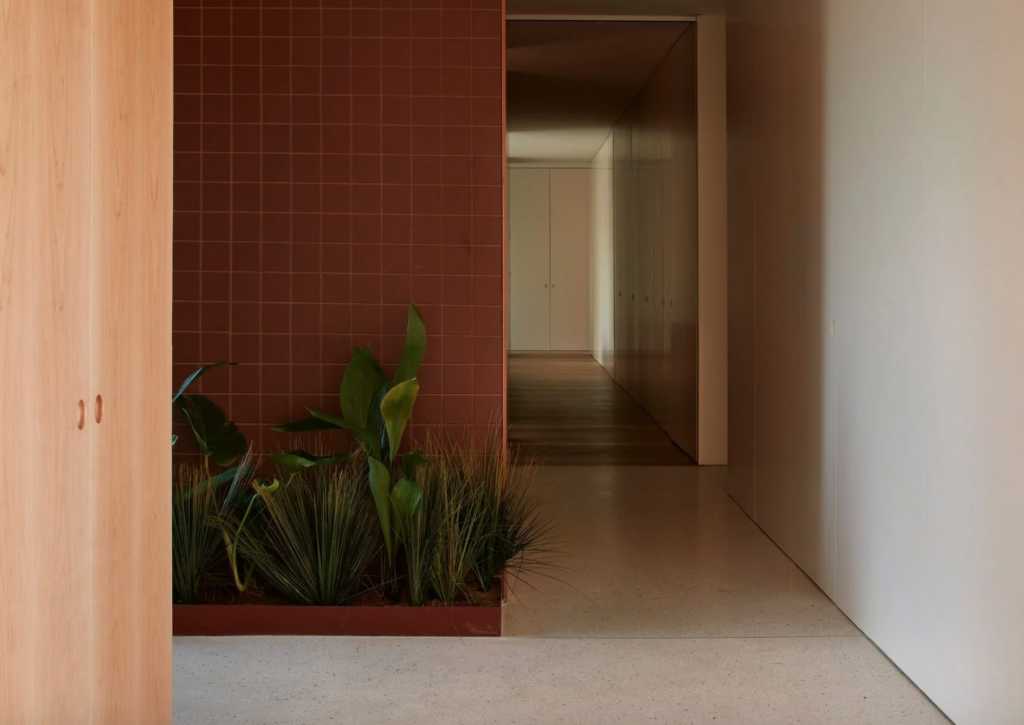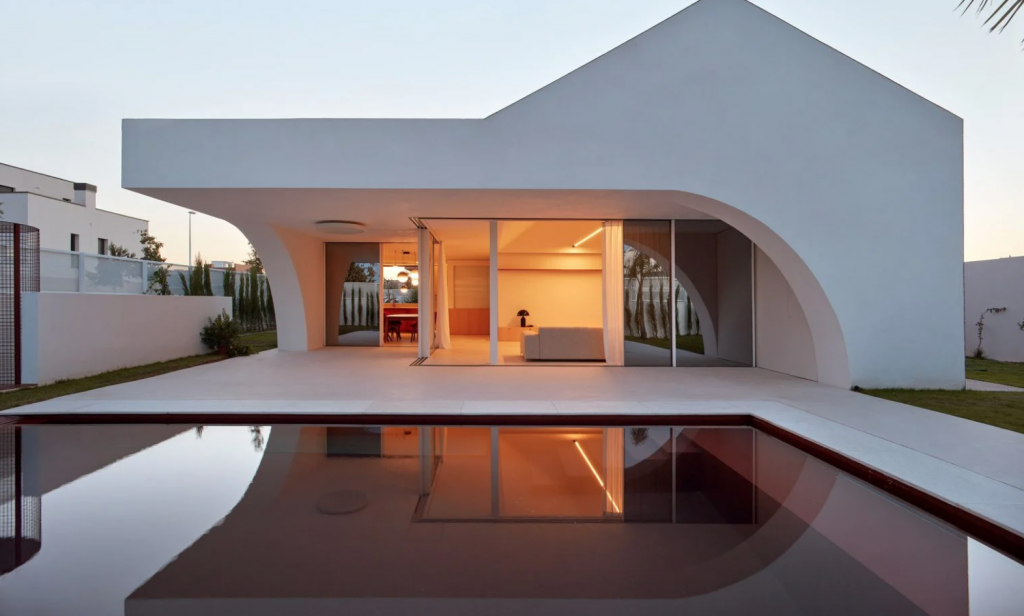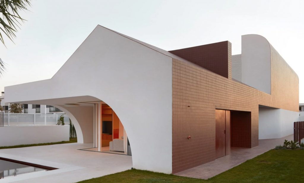 Rezydencja jednorodzinna rozwija się jako kontinuum przestrzeni w serii rozdrobnionych brył pokrytych białą wapienną okładziną, delikatnie skontrastowaną z ceramicznymi płytkami w kolorze terakoty. Zaprojektowany z myślą o prywatności i rzeźbiarskiej wrażliwości na abstrakcję geometryczną, dom charakteryzuje się kontrastującymi sekcjami zakrzywionych i prostokątnych ścian. Biała dwuspadowa forma wychodzi na basen na jednym końcu mieszkania i przecina się z półbeczkowym sklepieniem z peryskopowym świetlikiem na drugim. Dom rozwija się na dwóch poziomach; na parterze znajduje się przestronna część dzienna otwierająca się na wyłożone kafelkami patio i sypialnie schowane w bardziej intymnej części domu oraz górny poziom dla gości. W niższej, odosobnionej części znajdują się salony i małe baseny, połączone z tarasami na parterze czerwonymi spiralnymi schodami z metalu. Wewnątrz, uporządkowane i stonowane wnętrza dodają poczucia przestronności i otwartości. W całym budynku mocowania i meble z drewna klonowego i wiśniowego opierają się o śnieżnobiałe ściany i sufity, podobnie jak podłoga z lastryko łączy terakotę i biel na zewnątrz, jednocząc różne przestrzenie i dodając uroku całemu projektowi.