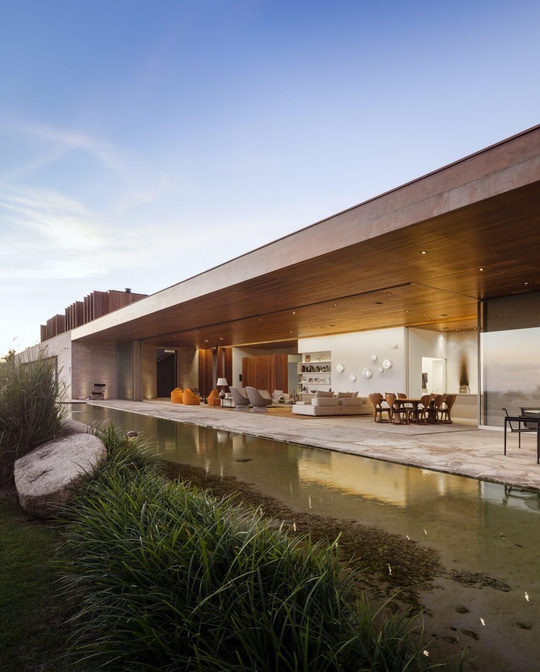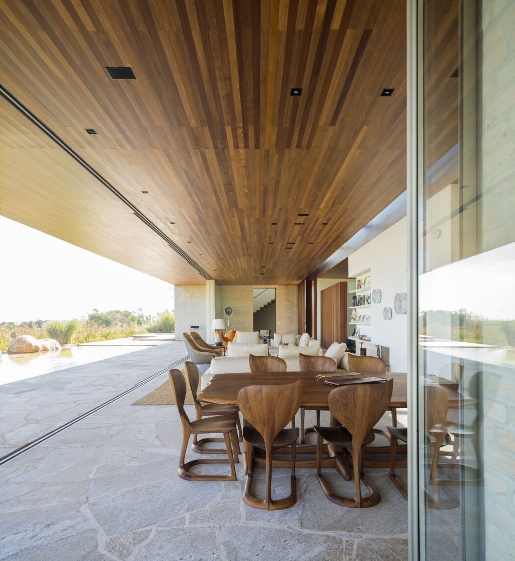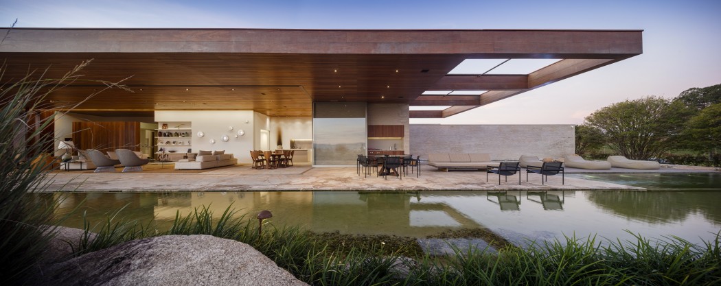 Projekt domu uwzględnia oszałamiające widoki na dziewicze otoczenie São Paulo, które tutaj odgrywają wiodącą rolę planu przestrzennego. Naturalne tarasy okalające dom tworzą relaksujące zakątki zachęcające do spędzania czasu na zewnątrz. Tło dla bryły budynku stanowi staw, który w jednym miejscu został pogłębiony by służyć jako basen, a w innym zarybiony i obsadzony wodnymi roślinami.