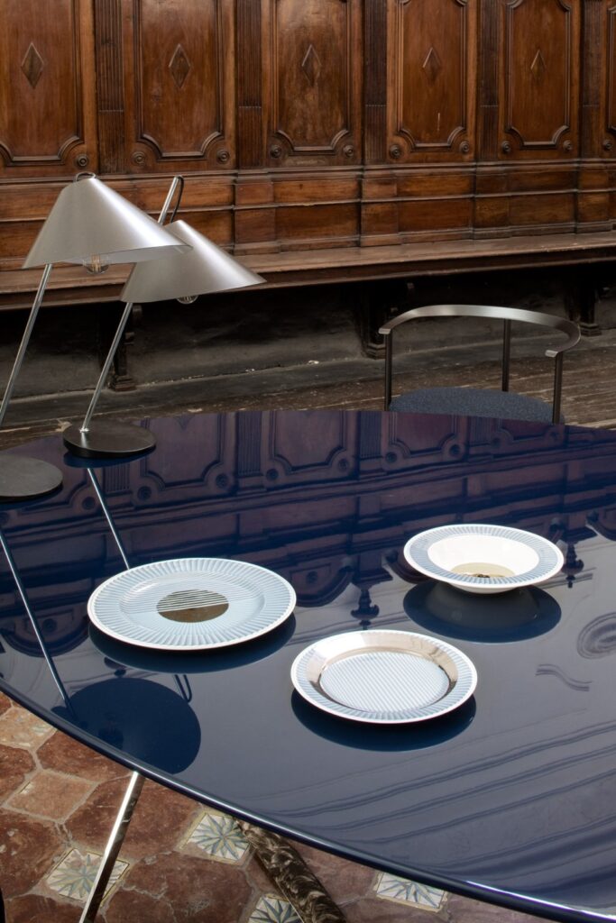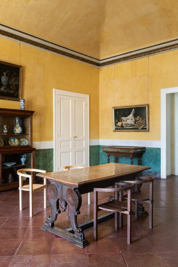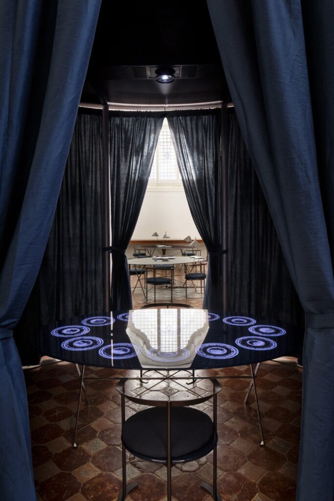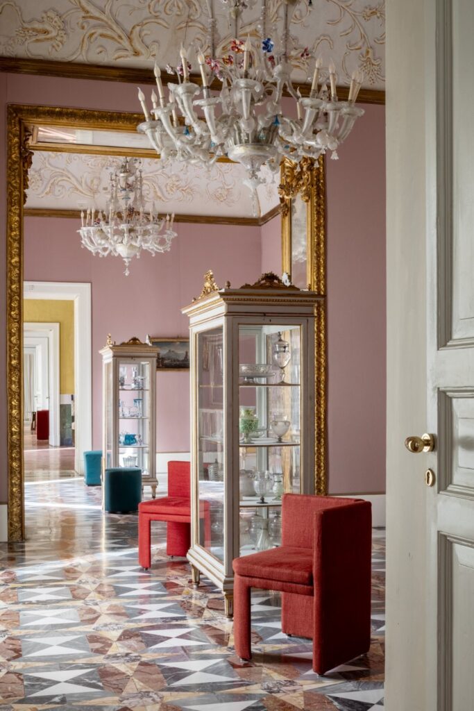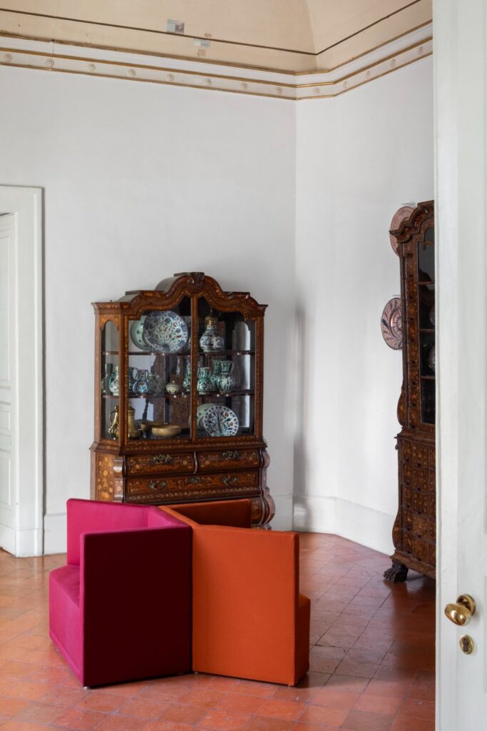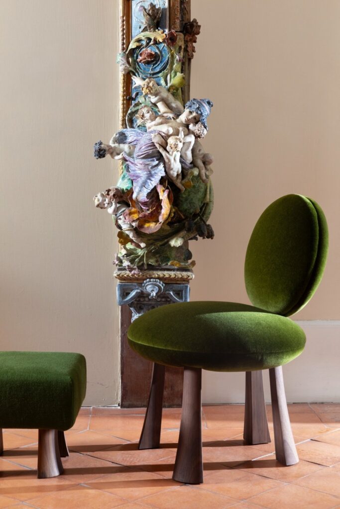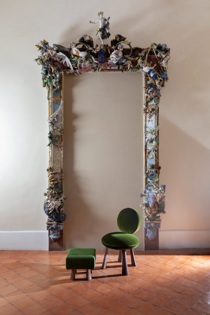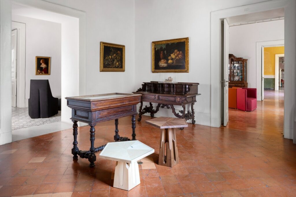 W Villa Floridiana Marta Sala Éditions stworzyła trasę ekspozycyjną, która ukazywała najsubtelniejsze i najbardziej wyrafinowane aspekty jej kolekcji – od mniej znanych, lecz wyrazistych ściennych lamp Claudia, luster Renoir, wazoników Tizio i Caio, po bardziej rozbudowane formy jak fotel Armory, pufy Tancredi i René oraz stolik Velazquez w nowej wersji z jasnego drewna. W dialogu z muzealnym kontekstem utworzono narrację o objętościach, proporcjach i rezonansie symbolicznym pomiędzy antycznymi a współczesnymi obiektami. To historia, którą należało kontemplować – gdzie design stawał się wizualnym doświadczeniem, delikatnie balansującym pomiędzy ewokacją, formą a pamięcią.