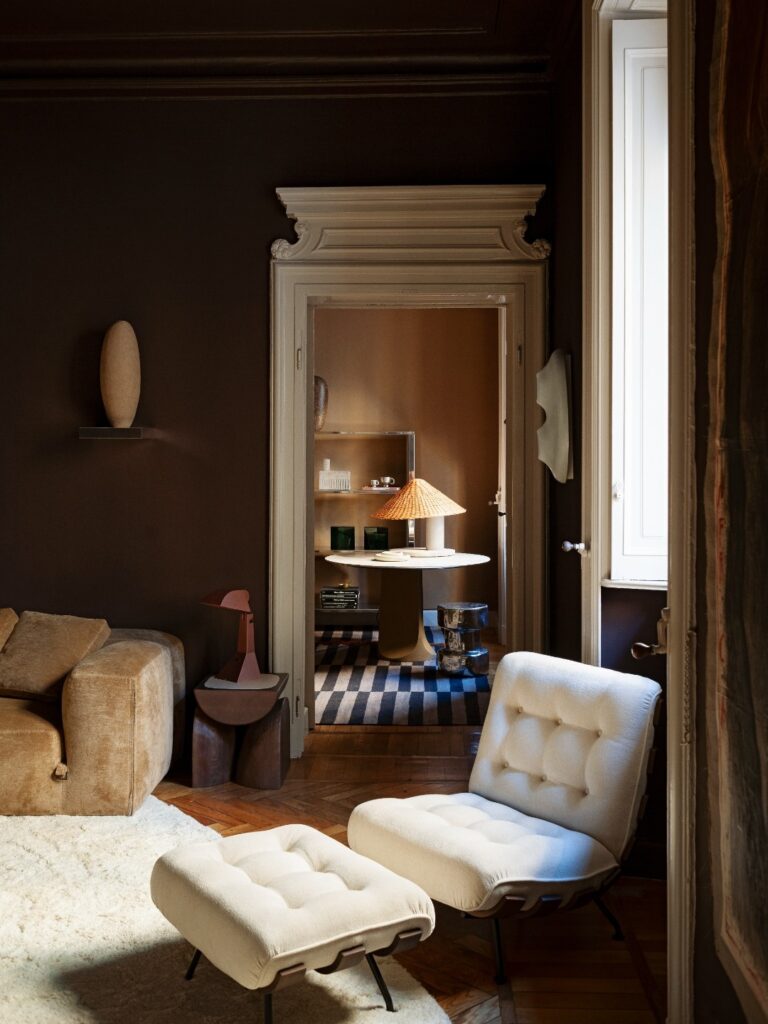 Studiopepe podkreśliło istniejące elementy architektoniczne, wprowadzając wyrafinowane skórzane i ziemiste odcienie, odważne kontrasty materiałowe oraz głębokie kolory, które dialogują z paletą Tacchini. Zastosowano także sekwencję pokoi przypominającą chińską szkatułkę, gdzie każda przestrzeń odkrywa kolejną, tworząc ciągły przebieg odkrywania. Drzwi i okna stają się narracyjnymi progiem – czasem podkreślonymi, czasem neutralizowanymi, a czasem przekształcanymi w pojemniki pamięci.