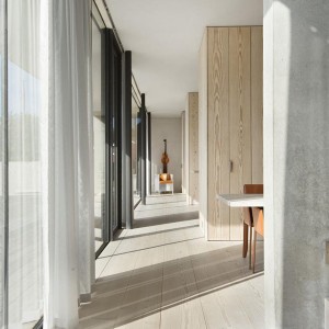 400 metrów drewnianego tarasu stanowi strefę przejściową pomiędzy wnętrzem, a bliskością morza. Pozwala na delektowanie się widokami i wygodne korzystanie z basenu i outdoorowej strefy jadalnej.