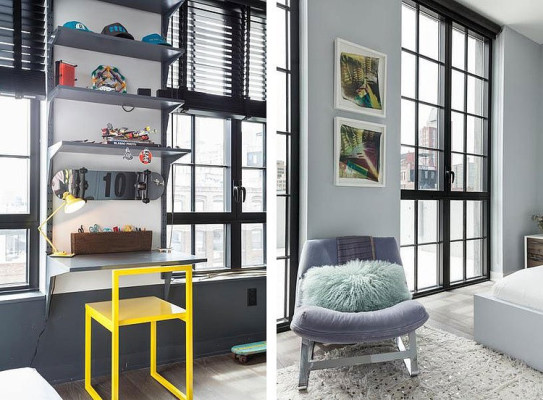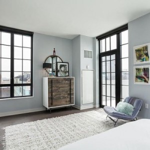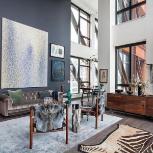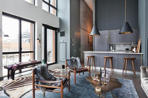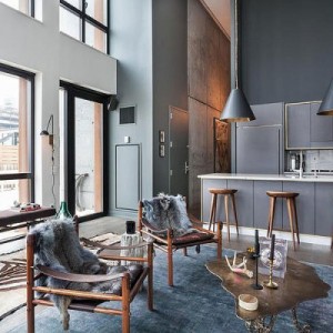 Zupełny brak przypadkowości, uważnie dobrane dodatki – naturalne skóry, drewniane stołki, mieszają się ze sztuką nowoczesną. Wnętrze z jednej strony eleganckie, z drugie z naleciałościami industrialnego luzu. Wysokie ściany i ogromne przeszklenia ujęte w metalowe ramy, nadają apartamentowi nieco nieformalny charakter. Mieszkanie mieści tylko to, co niezbędne, co szczególnie widać w minimalistycznie umeblowanych sypialniach. Tutaj można złapać oddech i oddać się relaksowi po wyczerpującym dniu.