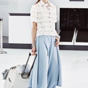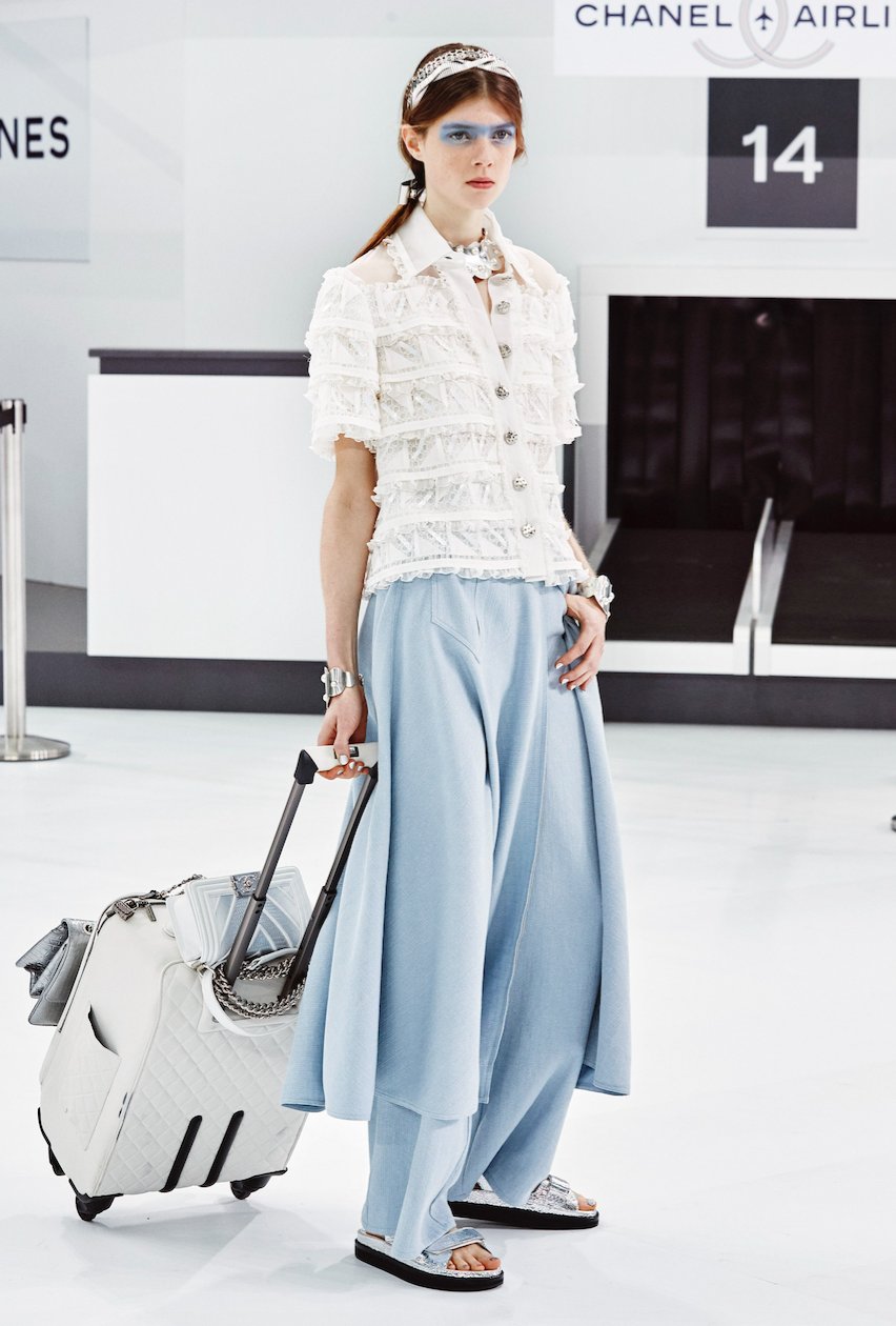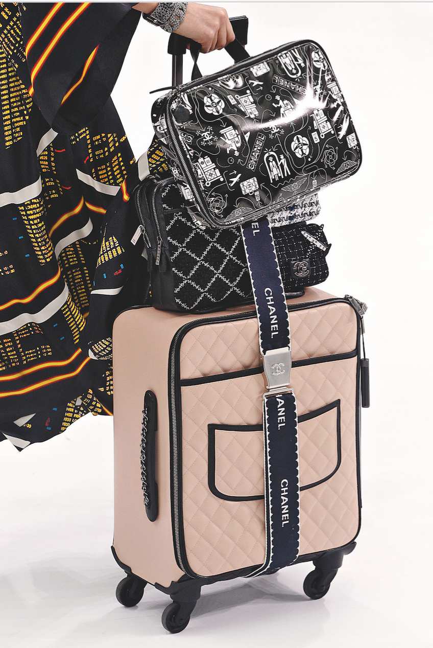 Inspirowane tętniącymi życiem lotniskami, wygodne, ale przede wszystkim niezwykle szykowne, walizki w kolekcji wiosna/lato 2016 jawią się w najróżniejszych wariantach i stylizacjach. Od kolorowych tweedów, znaków rozpoznawczych Chanel, poprzez skórzane pikowania, skórę aligatora czy opalizujące metalicznie silikonowe wykończenia. Do tego wygodne stroje, ultranowoczesne, na pograniczu chic i casual, w których kobieta wygląda swobodnie i niezwykle pewnie – wie dokąd zmierza.