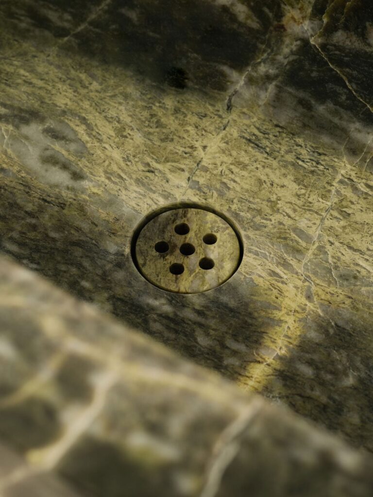 W przeciwieństwie do ciemnych stref, łazienka jest otwarta i jasna. Zielone szafki miętowego odcienia tworzą spokojną klarowność, a światło z cegły szklanej zmiękcza krawędzie. Centralnie umieszczona monolityczna umywalka z bogato żyłkowanego zielonego marmuru łączy się z czarną wanną przed lustrianą ścianą – formy te wnoszą futurystyczną obecność.