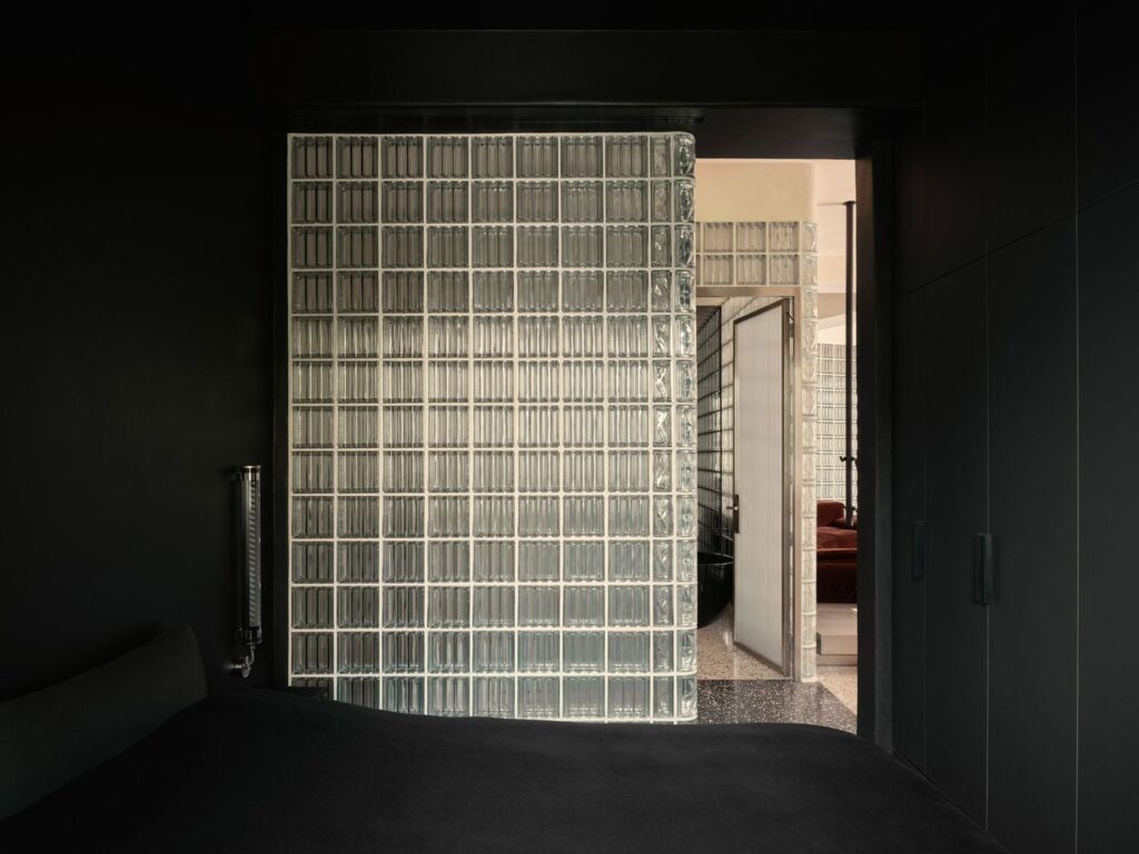 Po przekroczeniu progu cegły szklanej atmosfera staje się mroczna. Wejście, toaleta, gabinet i sypialnia mają czarne powierzchnie, ciemne terazzo i kontrolowane oświetlenie, przypominające intymne zakątki klubu nocnego.