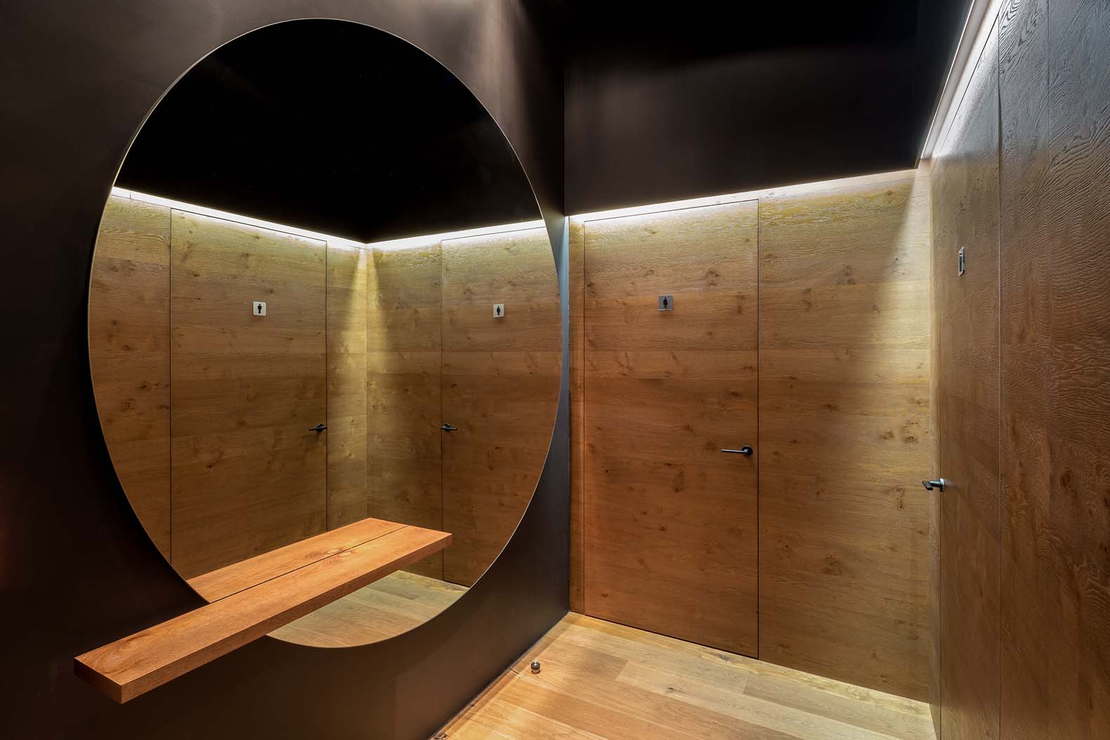 – Chcieliśmy mocno zaznaczyć ten centralny punkt restauracji – podkreśla Robert Majkut. – Powstał bardzo duży i intensywnie podświetlony kontuar, przy którym można usiąść i obserwować proces tworzenia dań. Jest on mocno wyeksponowany jako dominanta wnętrza, zwieńczona ścianą stanowiąca plecy baru, gdzie znajduje się najwięcej rozświetlonych elementów w całej restauracji. To serce tego miejsca.